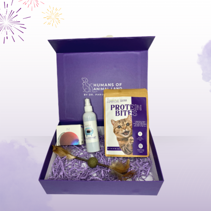 The Furrever Purr Treasure Pack is a festive delight for cats. Treats, toys, and a safe environment spray keep your kitty happy, playful, and stress-free this Diwali.