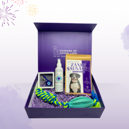 This treasure box is a perfect festive gift for pets. It has everything my dog needs to stay calm and safe during Diwali. The protective spray and toy are of great quality. Very happy with the purchase